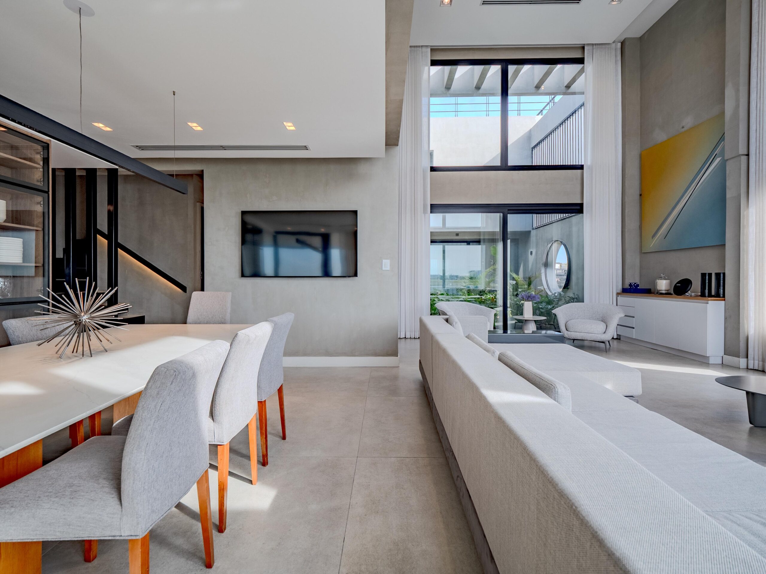 Impactante living en doble altura con vistas al patio interno con paisajismo selvático por un lado y vistas al lago por el otro ventanal.