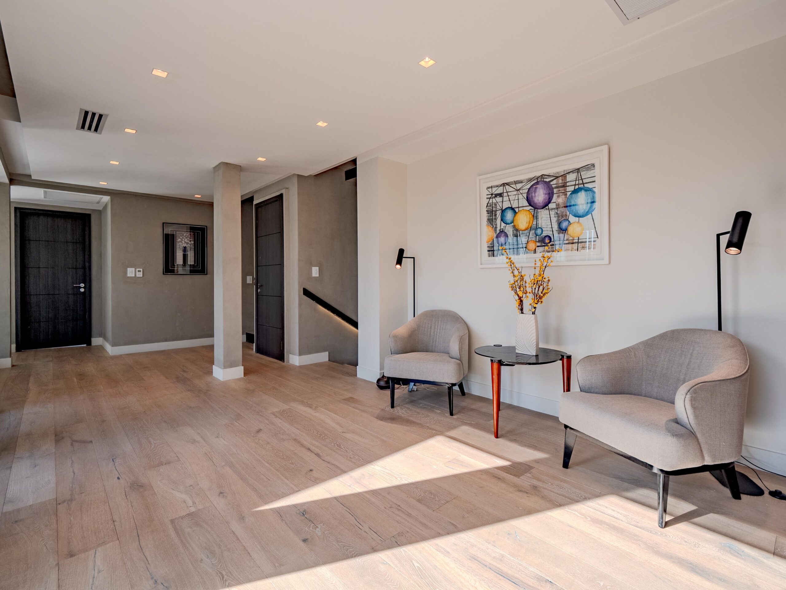 Hall con biblioteca y espacio de lectura.