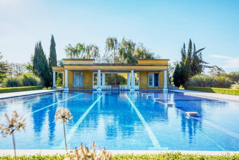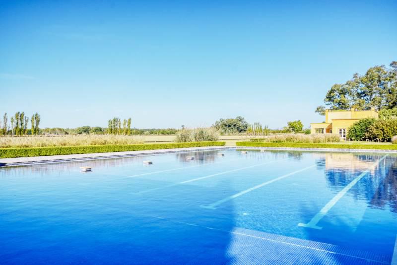 A pocos metros del Main House se encuentra la piscina climatizada de 30 por 15 metros, cuenta con solarium, zona de hidromasaje, amplio espacio playo apto para muebles y living y área de baja profundidad para niños.